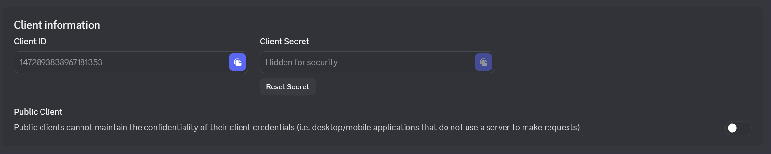 Back to the panel, change the Client ID and the Client secret to the ones Discord has given you.